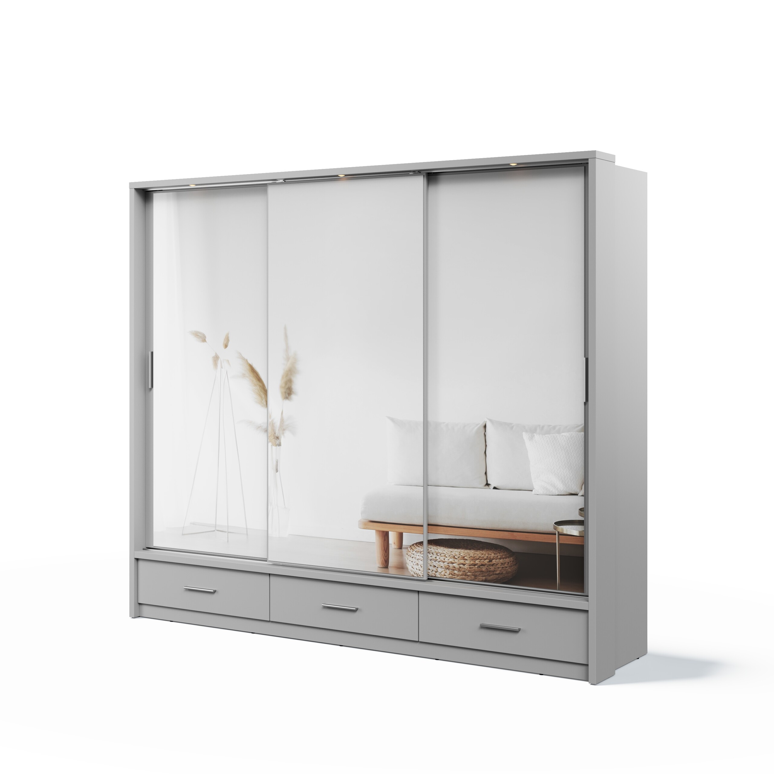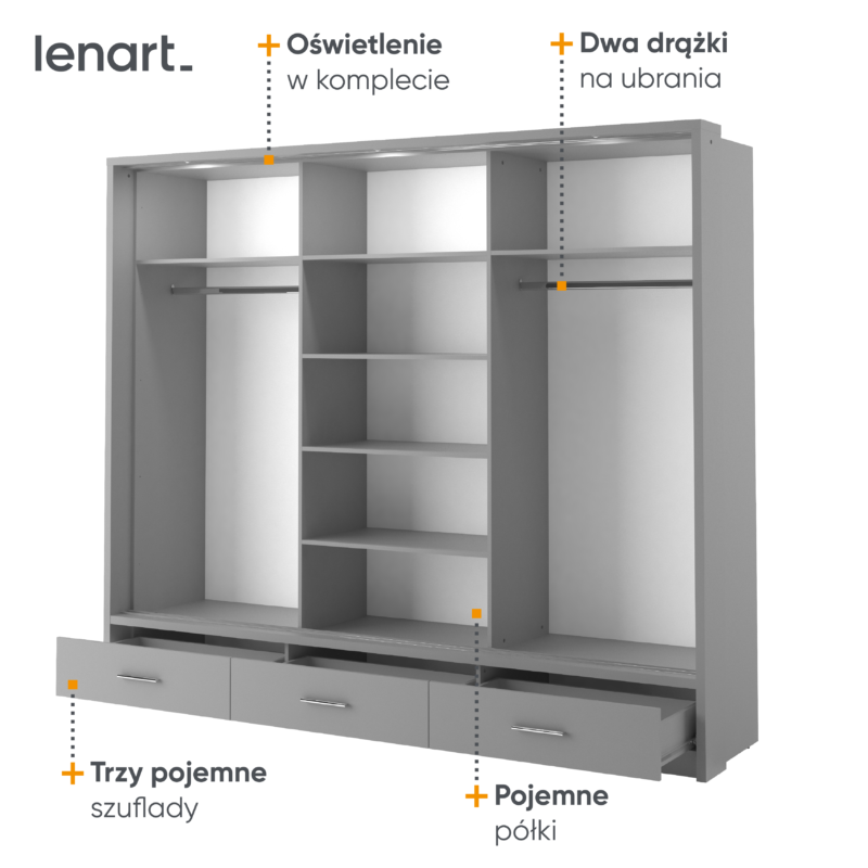 Pojemna szafa z trojgiem drzwi przesuwnych. Na każdym z frobtów znajduje się duże lustro. Na dole szafy zaplanowano trzy łatwo dostępne szuflady na bieliznę, dodatki lub inne akcesoria. Wewnątrz znajdziesz dwa drążki na ubrania oraz kilka pojemnych półek. Mebel możesz dostosować do swoich potrzeb, np. umieszczając półki w innych pionach.Szafa idealnie sprawdzi się w garderobie, sypialni i przedpokoju. Mebel dostępny jest w kilku wersjach kolorystycznych, dzięki czemu łatwo dopasujesz go do różnych stylów wykończenia wnętrza.Oświetlenie do szafy w komplecie.