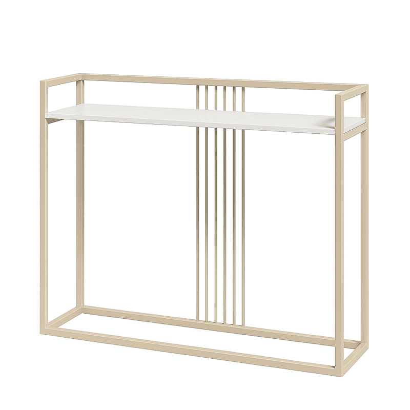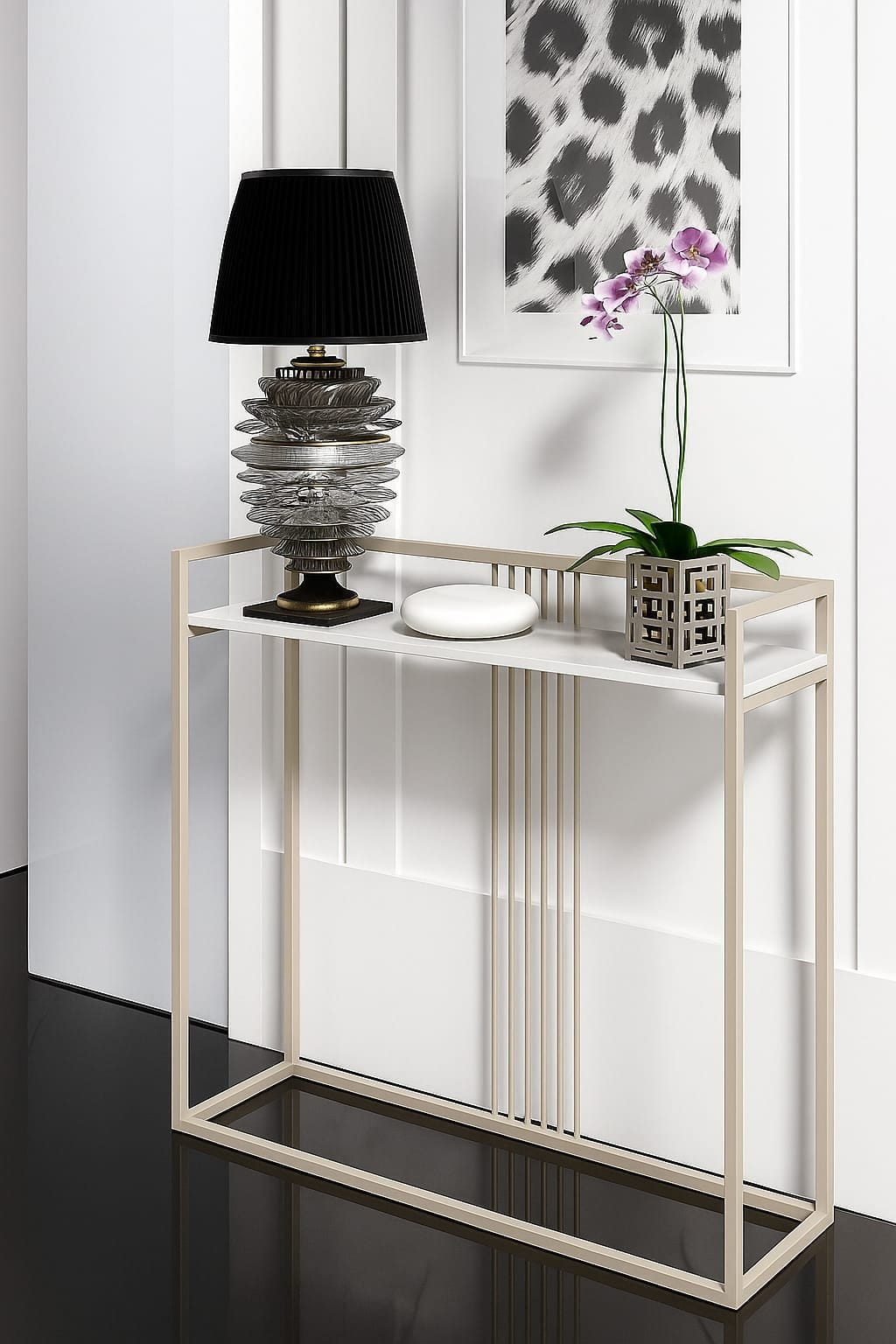 Konsola BESO w stylu glamour sprawi, że Twój salon lub przedpokój nabiorą dostojnego wydźwięku. Na metrowym blacie pomieścić możemy frywolny pojemnik na klucze, wazon z żywymi kwiatami czy zdjęcie rodziny. Dane techniczne:· Podstawa wykonana jest z solidnej stali malowanej proszkowo· Blat wykonany z płyty laminowanej· Grubość blatu 18 mm· Grubość okleiny PCV 2 mm